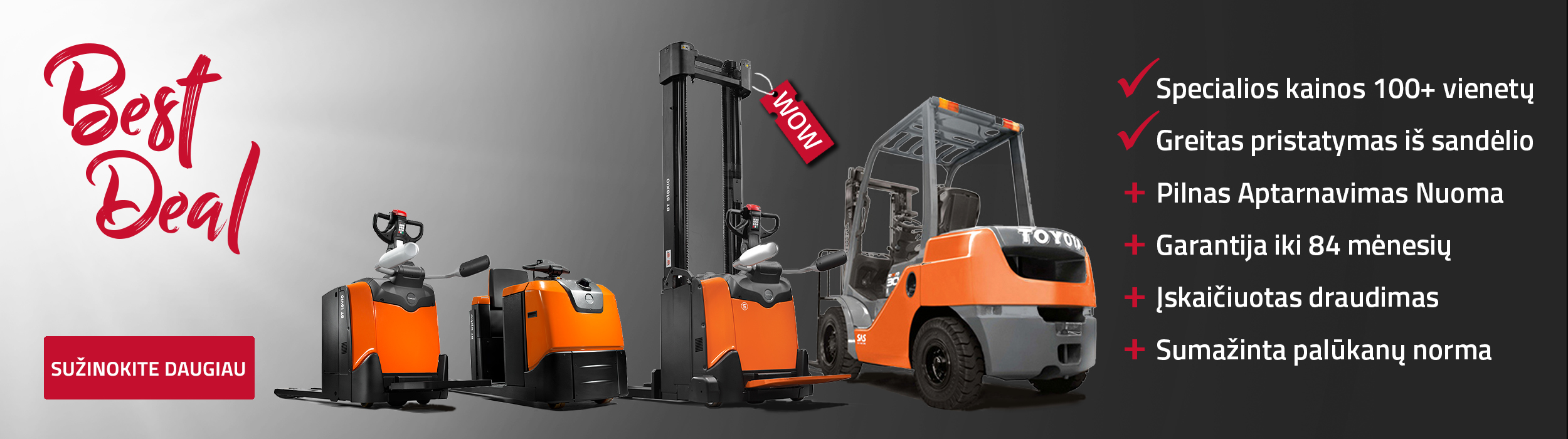 Įsigykite aukščiausios kokyės labiausiai jums tinkančią techniką. Siūlome pilną sandėliavimo ir krovimo technikos gamą: hidrauliniai vežimėliai, elektriniai vežimėliai, elektriniai keltuvai, užsakymų rinktuvai, rietuvai, VNA siaurų pravažiavimų keltuvai, tempikai, elektriniai šakiniai krautuvai, šakiniai krautuvai su vidaus degimo varikliais, stelažai ir automatizuoti sprendimai. Mūsų siūloma sandėliavimo technika gali būti pritaikyta dirbti šaldytuvuose, drėgnoje ir dulkėtoje aplinkoje, gamybos patalpose, parduotuvėse, lauko sandėliuose ir kituose specifiniuose sandėliavimo ir krovinių krovos objektuose. Pasiūlysime ypač palankias technikos įsigijimo ir finansavimo sąlygas.