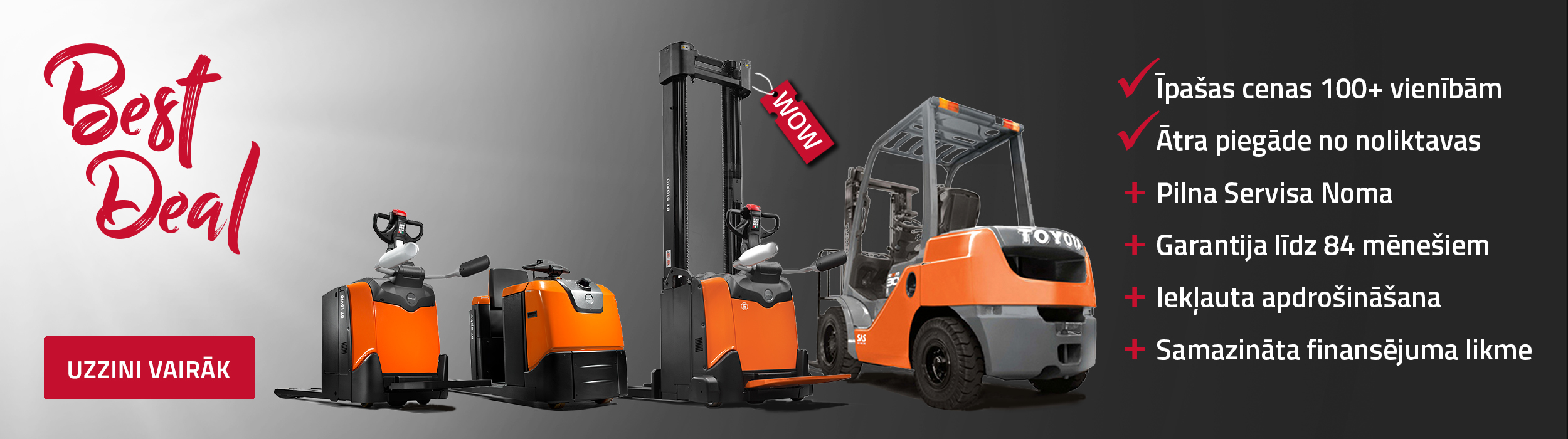 rokas palešu ratiņi, palešu pārvadātāji, krautņotāji, pasūtījumu komplektētāji, augsto plauktu palešu pacēlājišauro eju pacēlāji, vilcēji, elektriskie iekrāvējidīzeļa iekrāvējigāzes iekrāvēji, plaukti un automatizēti risinājumi.
