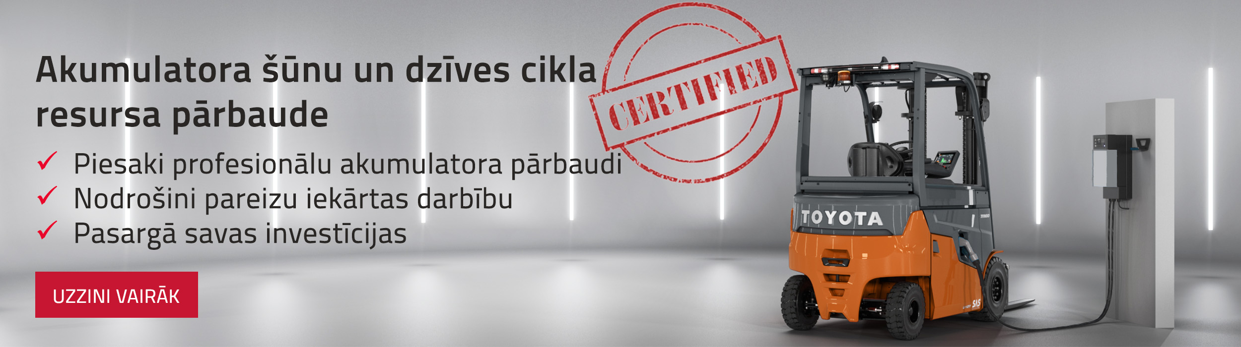 Bezapkopes baterijas nodrošina tehnikas darbību visu diennakti. Uzziniet vairāk par mūsu litija jonu akumulatoriem kā enerģijas avotu Jūsu nākamajai Toyota iekraušanas tehnikai.